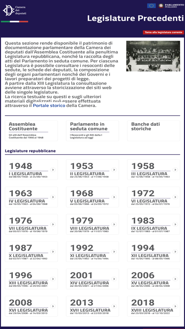 61%camera legislature i contenuti si riferiscono a tutte le legislature pregresse (tutte quelle prima di quella attuale) e per ogni legislatura è possibile consultare i lavori svolti, le schede deputati...