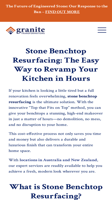 100%Stone kitchen benchtop resurfacing. Perfect for kitchen renovations, no demolishing, no mess and cost-effective solution. Free Quotes