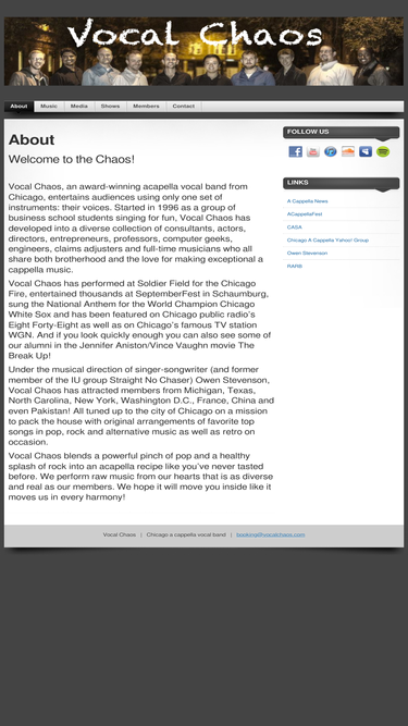 75%chicago's own pop/rock vocal group sings your favorites from the 60's through today. producers of the vocal music festival called acappellafest. available for weddings, corporate events, festivals, fairs and sporting events.