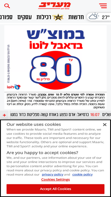 85%האתר הרשמי של עיתון מעריב, כל חדשות היום מהארץ ומהעולם במקום אחד. מבזקי חדשות, כתבות כלכלה, ספורט, רכילות, בריאות, טכנולוגיה מהארץ ומהעולם.