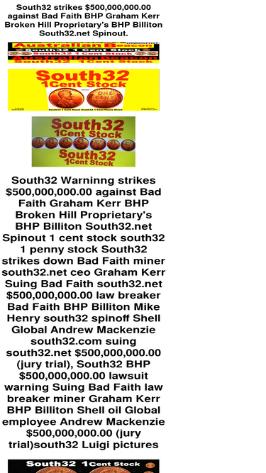 south32 warninng strikes $500,000,000.00 against bad faith graham kerr bhp broken hill proprietary's bhp billiton south32.net spinout 1 cent stock south32 1 penny stock south32 strikes down bad faith miner south32.net ceo graham kerr suing bad faith south32.net $500,000,000.00 law breaker bad faith bhp billiton mike henry south32 spinoff shell global andrew mackenzie south32.com suing south32.net $500,000,000.00 (jury trial), south32 bhp $500,000,000.00 lawsuit warning suing bad faith law breaker miner graham kerr bhp billiton shell oil global employee andrew mackenzie $500,000,000.00 (jury trial)south32 luigi pictures