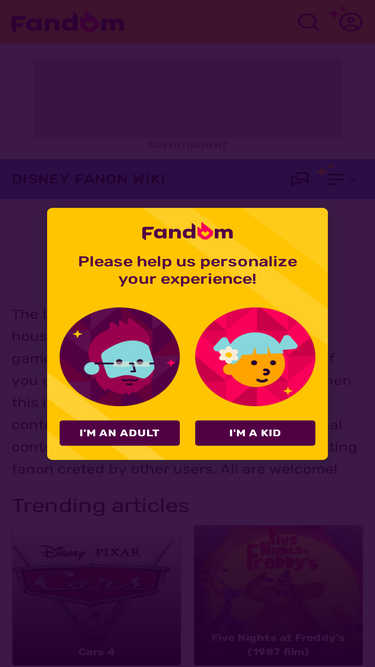 71%The Disney Fanon Wikia is a community site housing user-created Disney fanon (fake) games. If you like creating Disney fanon, or if you enjoy fanon that others have created, then this is the place for you! Come explore our content and feel free to add your own original content, so long as you don't mess with existing fanon creted by other users. All are welcome!
