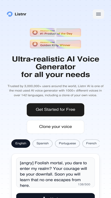 94%See the top AI apps, services, and tools in 2025. Get started with Listnr text to speech generator for free, generate text to voice in seconds.