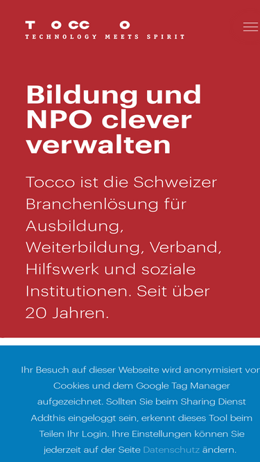 77%Tocco, die Schweizer Branchenlösung für Ausbildung, Weiterbildung, Verband und Hilfswerk. Inklusive Cloud, Betrieb und Datenhaltung Schweiz.