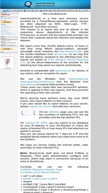 84%www.blocklist.de -- fail2ban-reporting service (we sent reports from attacks on postfix, ssh, apache-attacks, spambots, irc-bots, reg-bots, ddos and more) from fail2ban via x-arf. we report ssh-, mail-, ftp-, apache- and other attacks from fail2ban via x-arf