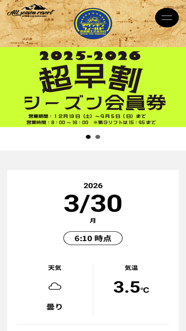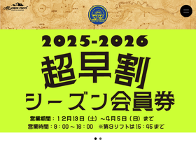 100%令和7年4月6日(日)16時をもちましてシーズンを終了いたしました。 今シーズンも沢山の笑顔をどうもありがとうございました。 また、お会いできる日まで、、、しばし充電。