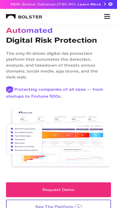 94%bolster ai security platform protects against phishing and scam activity with domain monitoring & takedowns, social media and app store protection