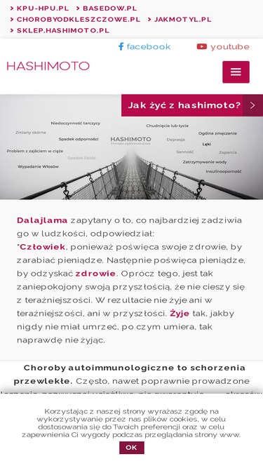 81%szystko o hashimoto w książce "jak żyć z hashimoto?". jedyny w polsce poradnik dla pacjnta. omówione objawy,leczenie,praktyczne rady. choroby autoimmunologiczne, to między innymi choroby tarczycy, nadnerczy,stawów,oskrzeli,skóry,choroby metaboliczne, choroba jelita grubego, choroba crohna. także choroba hpu zbiera swoje...