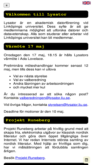 65%lysators starsida. en generell introduktion till föreningen, samt information om kommande händelser.