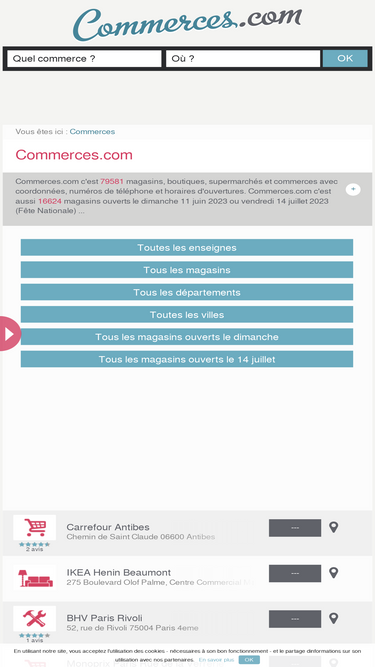 32%le site commerces.com vous propose de consulter facilement et rapidement les horaires d'ouvertures de 79585 magasins, supermarchés, salons, restaurants, ... et de vérifier s'ils sont ouverts le dimanche (3 octobre 2021) et les jours fériés (toussaint, le lundi 1er novembre 2021). vous pouvez aussi y trouver l'ensemble des coordonnées comme les numéros de téléphone, adresses email, sites internet, pages facebook, comptes twitter, adresses postales, coordonnées gps, les plans et accès en voiture, bus, tram, métro, rer, ...