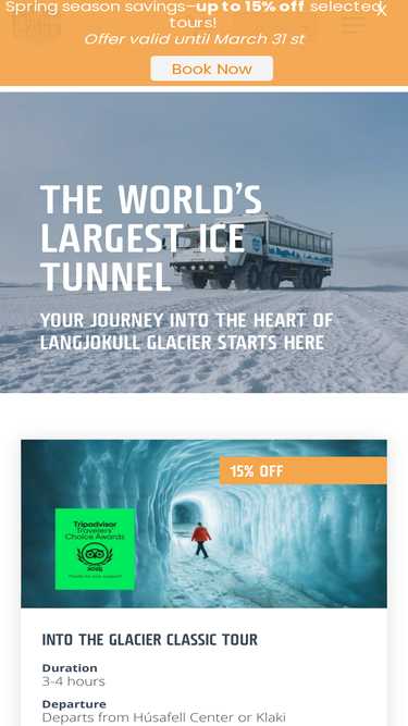 61%Into the Glacier offers various tours into the man-made Ice Caves in Langjökull. Once in a lifetime trip to the amazing Ice Tunnels.
