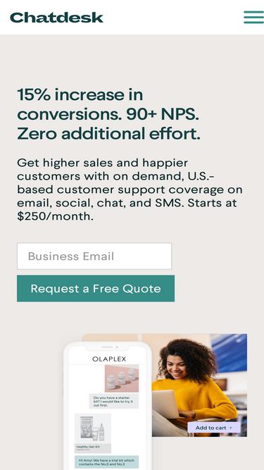 81%Helping companies deliver consistently excellent customer experiences, one message at a time. Chatdesk creates software that help companies deliver better customer support, drive sales growth and scale efficiently.