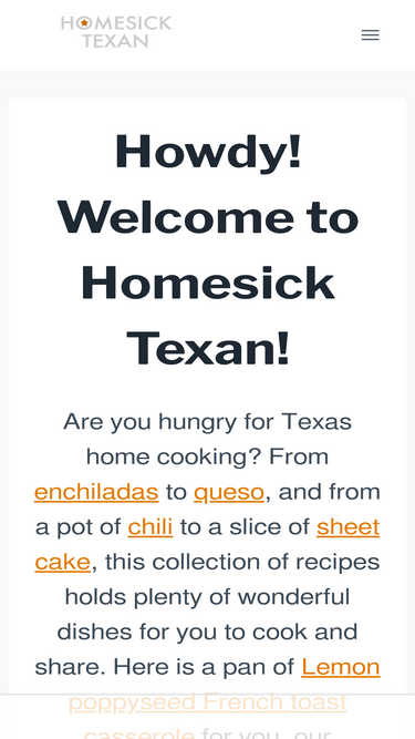 63%Howdy! Welcome to Homesick Texan! Are you hungry for Texas home cooking? From enchiladas to queso, and from a pot of chili to a slice of sheet cake, this collection of recipes holds plenty of