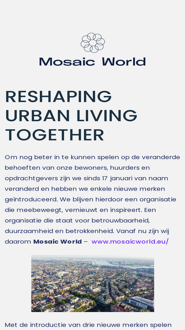 87%Wij zijn Mosaic World, en wij geven de filosofie van stedelijke gemeenschapsontwikkeling een nieuwe vorm en verbinden bewoners, steden en huiseigenaren met elkaar, zodat iedereen er beter van wordt.