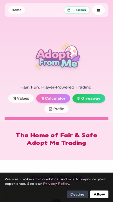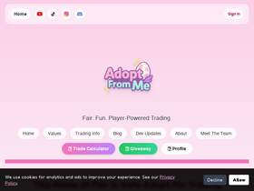 adoptmetradingvalues.com is made for players of the roblox adopt me game. check if trades are fair and make trades with other users.