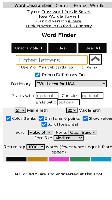 word unscrambler finds high scoring words for scrabble and words with friends and other word games. turn any letters into hundreds of playable words! supports twl, sowpods, wwf and other dictionaries. sort words by value and length and view definitions. word unscrambler comes in handy to test your vocabulary and to cheat in word games