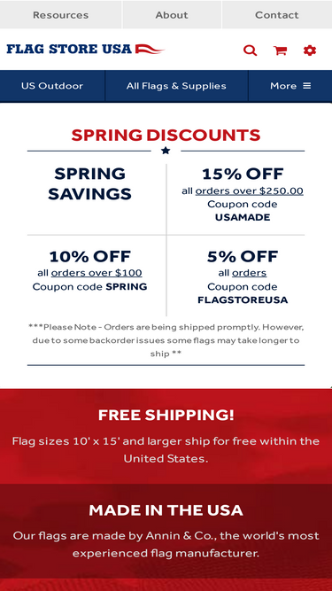 Buy flags online from the most reliable Flag Store on the Internet. FlagstoreUSA.com sells American made flags and supplies of all types.