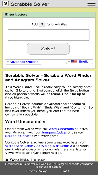 Scrabble Solver is a Word Finder for games such as Scrabble, Words With Friends, Wordfeud and Wordle. Includes definitions and scores for all words. Finds all possible words from the entered letters, including blank tiles.