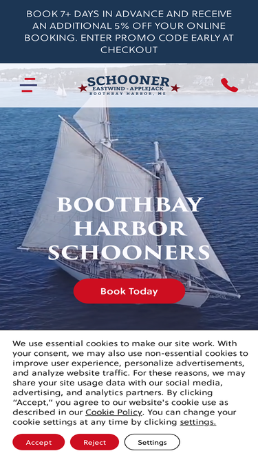 Sail on the historic Boothbay Harbor Schooners, Schooner Eastwind and Schooner Applejack. Experience a day sail, sunset sail or private charter from Boothbay Harbor
