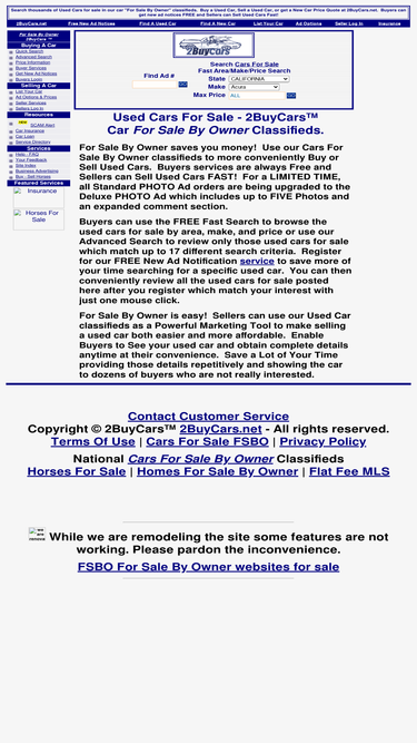 Used Cars for sale at 2BuyCars.net - FREE Search of our database which has thousands of used cars for sale. We also offer FREE used car shopper and pricing services. Sell your car using our used car classifieds, we offer comprehensive advertising services for the For Sale By Owner. We make buying or selling used cars For Sale By Owner easy.