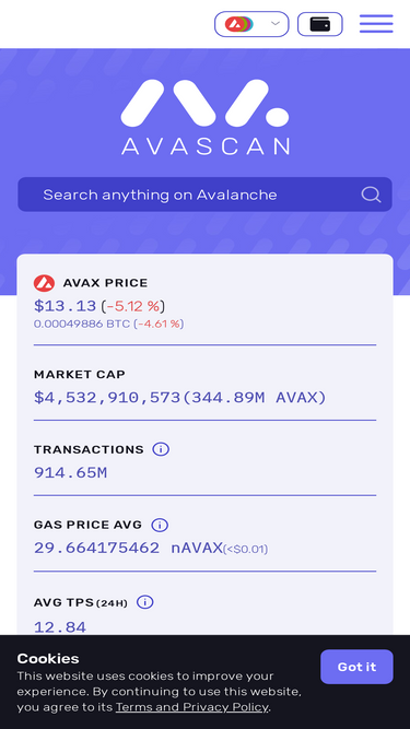 Explore the Avalanche network: search Blockchains, Transactions, Assets, Validators, Delegations, Staking statistics and Supply data