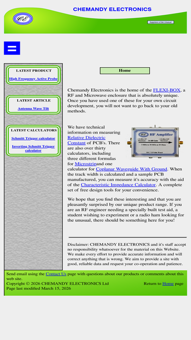 98%home page for chemandy electronics limited with rf and microwave articles, calculators and flexi-box products (rf and microwave test aids and enclosures).