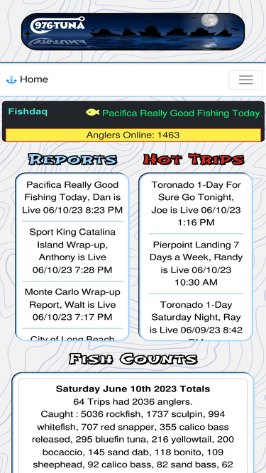 976-tuna the original leader in fish reports, #1 since 1985! 976-tuna southern california source from san diego to san francisco fish reports. information includes fish counts, live audios, current schedules, and more!
