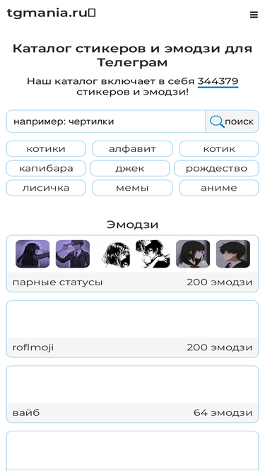 80%новые и популярные стикеры и эмодзи telegram в нашем бесплатном каталоге. все эмодзи и стикеры можно бесплатно установить в telegram.