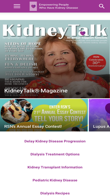 The Renal Support Network (RSN) is a national kidney patient organization. RSN's online kidney disease support groups and other programs that empower people who have kidney disease to become knowledgeable about their illness, proactive in their care, hopeful about their future and make friendships that will last a lifetime.