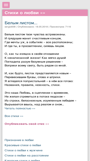 100%добро пожаловать в сказочный мир любви и отношений! тут вы найдете множество романтических историй, стихи о любви, полезные статьи, и психологические тесты на любовь!