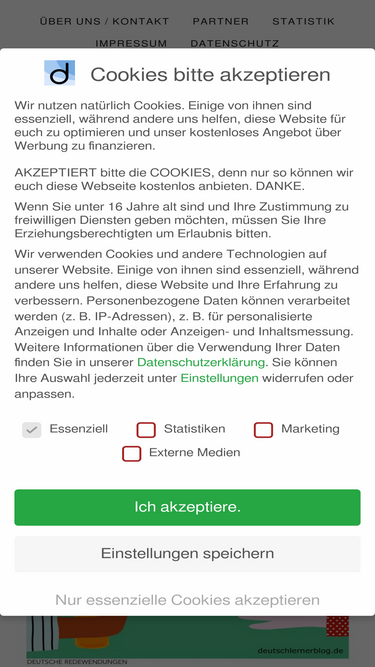 Kurzinformation zu den Cookies Wenn du direkt vom Cookie-Banner auf diese Datenschutzseite kommst, so willst du bestimmt schnell erfahren, was es mit den Cookies auf sich hat. Du findest alle Informationen in der Datenschutzerklärung, aber wir wollen dir hier einen kleinen Überblick geben. Warum Cookies?Wir benutzen Google-Analytics, um statistische Informationen über die Zugriffe auf Deutschlernerblog zu bekommen. Dies hilft uns, zu erkennen, welche Inhalte besonders beliebt sind, und ist wichtig bei der Entscheidung, welche Inhalte und Materialien wir für euch erarbeiten und bereitstellen. Das gesamte Angebot auf Deutschlernerblog ist für alle kostenlos und frei zugänglich. Natürlich müssen wir unsere Arbeit irgendwie finanzieren. Das versuchen wir über die Werbung mit Google-Adsense und dem Amazon-Partnerprogramm. Ohne diese Finanzierung würde es den Blog nicht geben. Wie Google eure personenbezogenen Daten verwendet, wenn ihr eure Einwilligung erteilt, erfahrt ihr hier: Google-Website zum Datenschutz und den Nutzungsbedingungen Was, wenn du nicht willst, dass Cookies eingesetzt werden?Die konsequenteste Maßnahme wäre, auf das Angebot von Deutschlernerblog zu verzichten und diesen Blog nicht mehr zu besuchen. Es wäre natürlich schade, wenn du diesen …