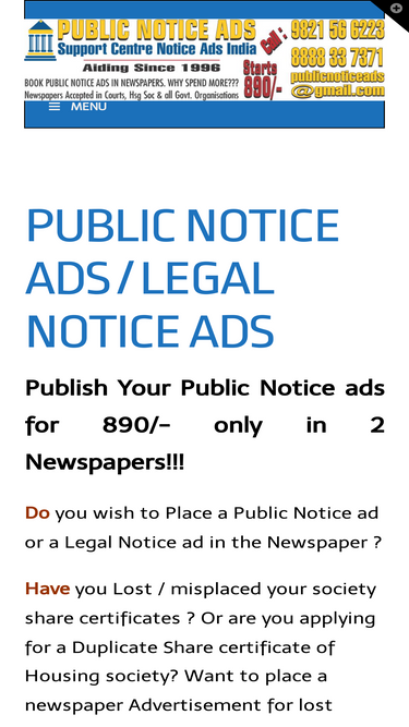 74%PUBLIC NOTICE ADS / LEGAL NOTICE ADS 890/- onwards for publishing in 2 newspapers. call : 9821566223 /8888337371 / 9090353586. GET FREE Artwork. SHARES LOST Ads in 2 Newspapers published for 890/- only