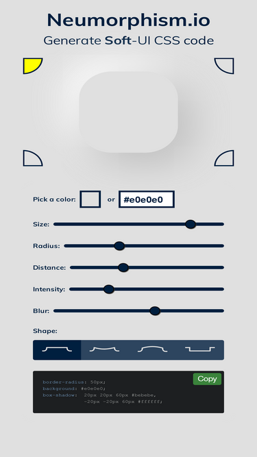 100%CSS code generator that will help with colors, gradients and shadows to adapt this new design trend or discover its posibilities.