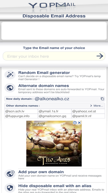 91%YOPmail vous propose une fausse adresse mail temporaire et anonyme. Ce mail jetable et gratuit vous aidera à contrer le spam. Adresse email jetable anti-spam.