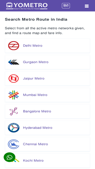 YoMetro is the India's metro route finder, helps you to find metro routes, route maps, metro line route map, timings, distance, stations, entry and exit gates, ATM, feader bus and more of all active metro networks in India like Delhi, Gurgaon, Noida, Hyderabad, Bangalore, Kolkata etc.