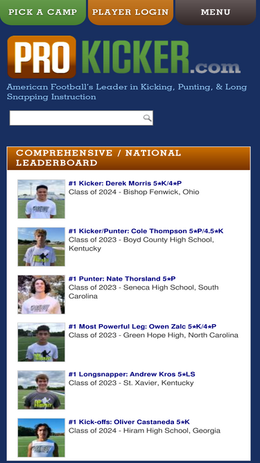 american football's #1 kicking camps, punting camps and long snapping camps - athletes can learn to be their own kicking coach at the most comprehensive kicking camps, punting camps and long snapping camps in american football. prokicker.com kicking camps provide instruction and training opportunities in more locations, in more states, than any other program of its kind. the two-day kicking academy, one-day kicking camps, or skill charting only camps are available now for athletes to learn to become their own coach!