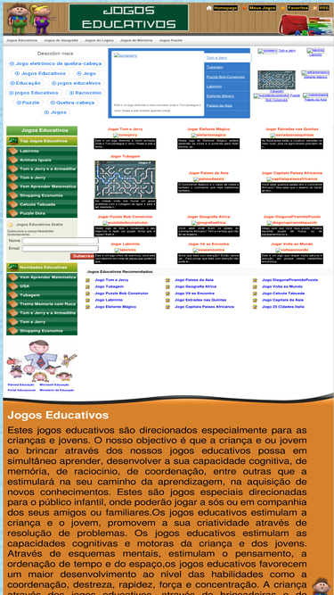 jogos educativos, onde você se pode divertir e aprender ao mesmo tempo. este é um site de jogos onde as actividades são especificas a pensar no desenvolvimento cognitivo da criança. promovem a sua criatividade através de resolução de problemas.