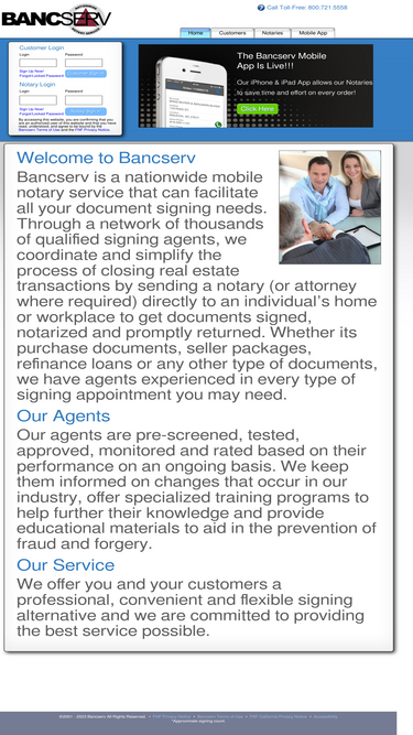 Bancserv is a nationwide mobile notary service that can facilitate all your document signing needs. Through a network of thousands of qualified signing agents, we coordinate and simplify the process of closing real estate transactions by sending a notary (or attorney where required) directly to an individual’s home or workplace to get documents signed, notarized and promptly returned.