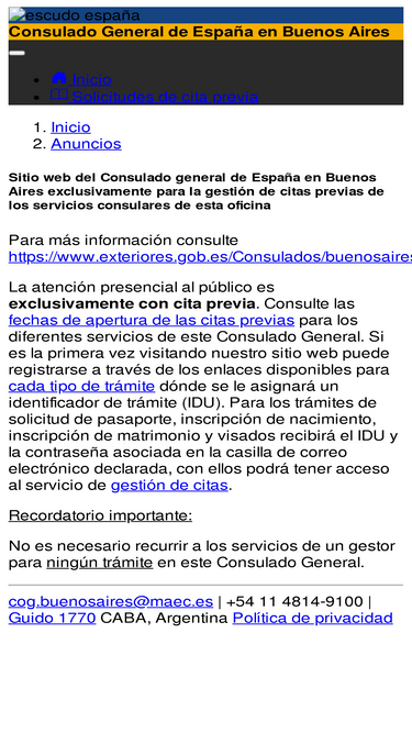 sitio de gestión de citas del consulado de españa en buenos aires. solicitud de citas y turnos para: nacionalidad española, pasaporte español, visados para españa e inscripción de matrimonio en españa. puede solicitar certificaciones de nacimiento, matrimonio o defunción de este u otros registros civiles españoles. buscador de registros civiles, consulados y embajadas españolas
