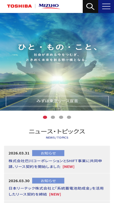 みずほ東芝リースは、メーカー系リース会社としての基盤に、みずほのグループ連携力を融合した金融にとどまらない多面的なサービス提供を通じて、全てのお客さまのニーズにお応えすることで、未来につながる持続可能な社会の実現に貢献してまいります。