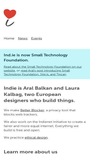 72%indie is aral balkan and laura kalbag, two european designers who build things. we make better blocker, a privacy tool that blocks web trackers. we also work on the indienet initiative to create a fairer and more equal internet. everything we build is free and open. we practice ethical design.