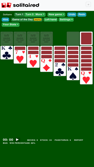 94%In Klondike Solitaire Turn Three, you build four foundation piles in ascending order by suit and the stockpile deals three cards at a time. Play online today!