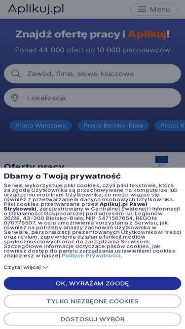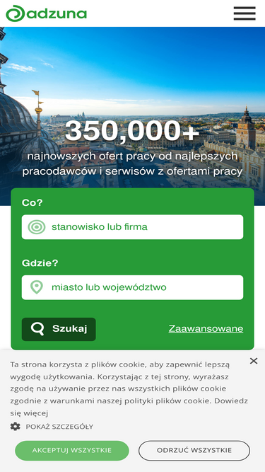 58%Adzuna to wyszukiwarka internetowa, która zbiera setki tysięcy ofert pracy z różnych stron www i udostępnia je w jednym miejscu. Odkryj oferty pracy w Twojej okolicy i całej Polsce już teraz!