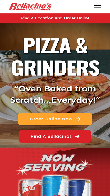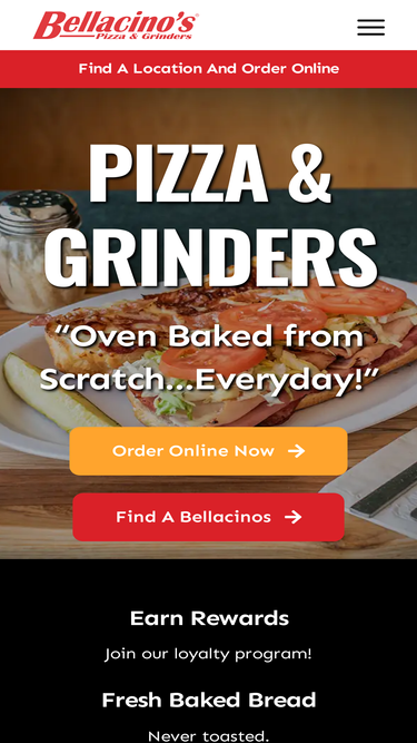 61%Bellacinos Party Box! Any 5 Whole Grinders... Ready in less than 20 Minutes! ITALIAN GRINDER – HOUSE SPECIALTY Ham, sausage, salami, mushrooms, onions, green peppers, cheese, lettuce, tomatoes & mayo BELLACINO’S ZESTY DELITM Capicolla (Italian ham), salami, pepperoni, onions, green peppers, mushrooms, cheese & pasta sauce PIZZA Pepperoni, pizza sauce, mozzarella cheese BELLACINO’S CLUB Turkey, ham, bacon, cheese,