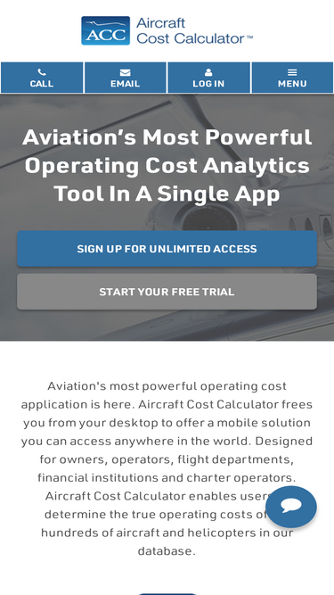 91%Determine the actual costs of owning and operating over 500 types of aircraft with ACC, a powerful, easy to use global web application. Owners, operators, flight departments, and financial institutions can start a free trial and get results in minutes.