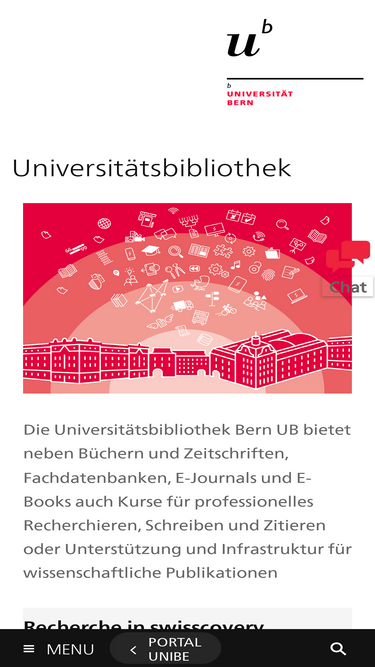 93%Die Universitätsbibliothek Bern UB betreibt neben der Bibliothek Münstergasse 9 Fachbereichs- und Fakultätsbibliotheken und die 27 Institutsbibliotheken der Universität Bern.