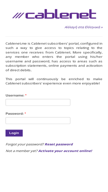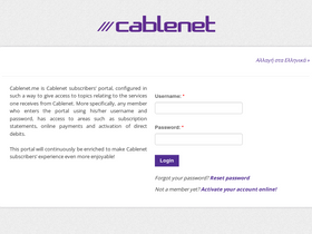 73%Η Cablenet.me πύλη (portal) είναι η πύλη των συνδρομητών της Cablenet, διαμορφωμένη με τέτοιο τρόπο που δίνει πρόσβαση σε θέματα που αφορούν τις υπηρεσίες που λαμβάνει κανείς από την Cablenet.
