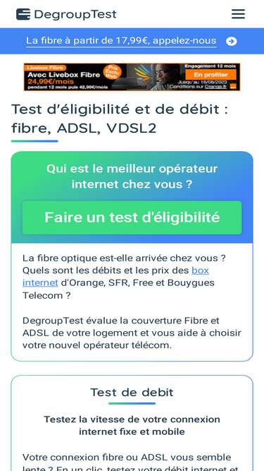 79%Qui d'Orange, Free, SFR ou Bouygues Telecom délivre le meilleur débit en fibre optique ? Quelle est la vitesse moyenne d'une connexion 4G ou 5G ? Chaque mois, DegroupTest publie son baromètre des débits internet et vous indique les vitesses moyennes des internautes ayant testé leur débit via notre speedtest.