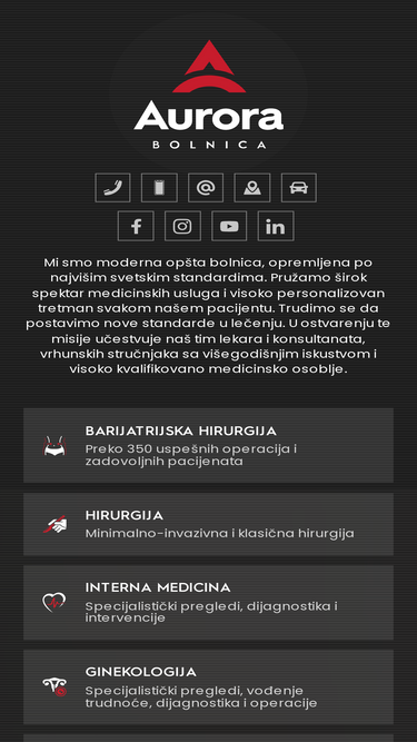 Najčešća masovna, hronična, nezarazna bolest u 21. veku je gojaznost. Svetska zdravstvena organizacija (WHO) je 1991. godine definisala ovu bolest, a vrlo brzo proglasila i globalnu epidemiju gojaznosti. Prekomerna telesna masa jedan je od najvećih problema povezanih sa današnjim životnim stilom i ishranom. {module 1091} {module 1146} Operacije protiv gojaznosti su počele sa se izvode intenzivno onda kada je postalo jasno da je rizik od iznenadne smrti kod preterano gojazne osobe mnogo veći nego sam rizik od operacije. Barijatrijski hirurški postupci uzrokuju gubitak težine na sledeće načine: Restriktivnost - ograničavaju unos hrane tj. onemogućavaju unošenje velike količine hrane Malapsorptivnost - uzrokuju smanjenje apsorpcije ("upijanja") hranljivih materija Kombinovano - restriktivnost + malapsorptivnost {module 1144} {module 1143} {module 721} {module 722} {module 740} U Aurori se izvode sledeće intervencije: {module 680} {module 1146} {module 683} {module 904} {module 517}