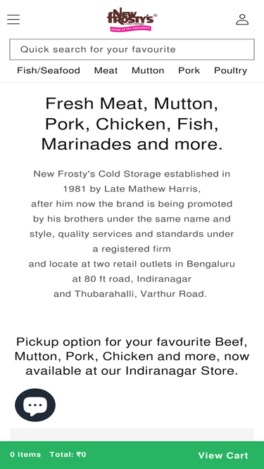 40 years of Bangalore's Best and Fresh Beef, Mutton, Pork, Chicken, Fish, Prawn, Crab, Sausages and more delivered to your home from Indiranagar and Whitefield. Order Online to get free delivery or Pick Up at our stores.
